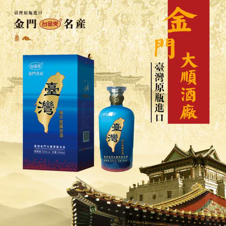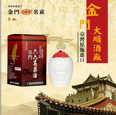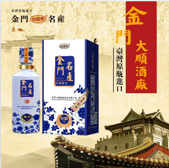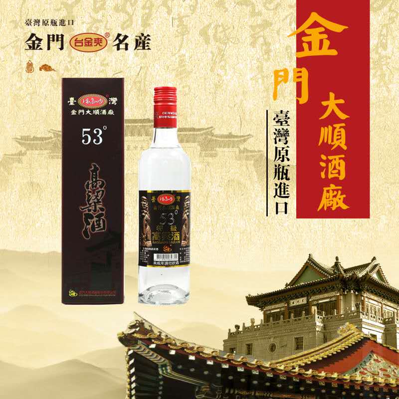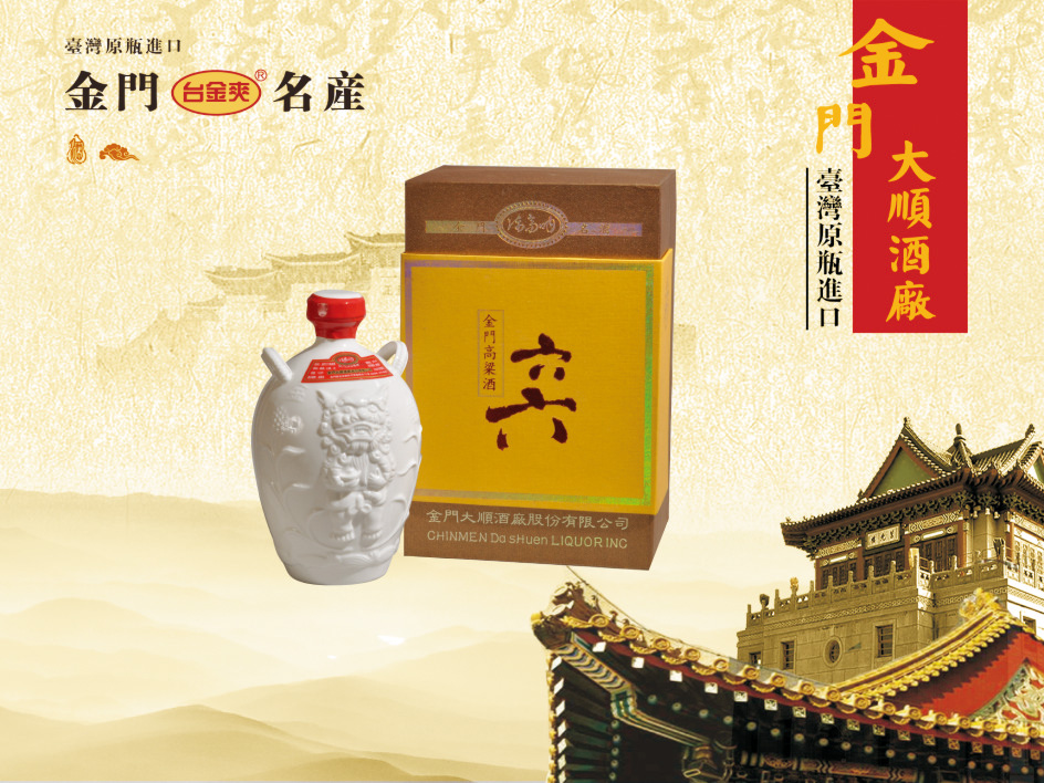 金門大順酒廠,座落于金門北緯24.5度,地處海隅,濱大陸,得天獨(dú)厚的地理,使它擁有絕佳的水質(zhì)、空氣、氣候及原料的四大天然釀酒條件。金門大順酒廠的高粱酒釀造是利用金門特產(chǎn)『旱地高粱』、引用當(dāng)?shù)厮|(zhì)甘甜的泉水、金門潔凈的空氣與氣候條件,并承襲傳統(tǒng)古法之釀酒技術(shù),加上獨(dú)家的釀酒專業(yè)技術(shù)經(jīng)驗(yàn)【三離二鍋一翻】的發(fā)酵釀酒工藝,經(jīng)掐頭去尾后入庫(kù),去蕪存菁。而造就出金門大順酒廠的高粱酒特色「清澈透明、質(zhì)地純凈、芳香濃郁」之一系列高粱酒。金門大順酒廠制酒承襲著金門得天獨(dú)厚的地理環(huán)境,加上三代流傳之古法醇釀技技術(shù),結(jié)合經(jīng)驗(yàn)與現(xiàn)代化生產(chǎn),釀出風(fēng)味獨(dú)特,香、醇、甘、冽的【臺(tái)島】【臺(tái)金爽】【牛樟芝高粱酒】【龍騰鳳舞】【紅雙十】【陳高吶】【臺(tái)灣小酒】等多樣系列產(chǎn)品。真實(shí)原味、清香散發(fā),甘冽醇厚的絕佳風(fēng)味。